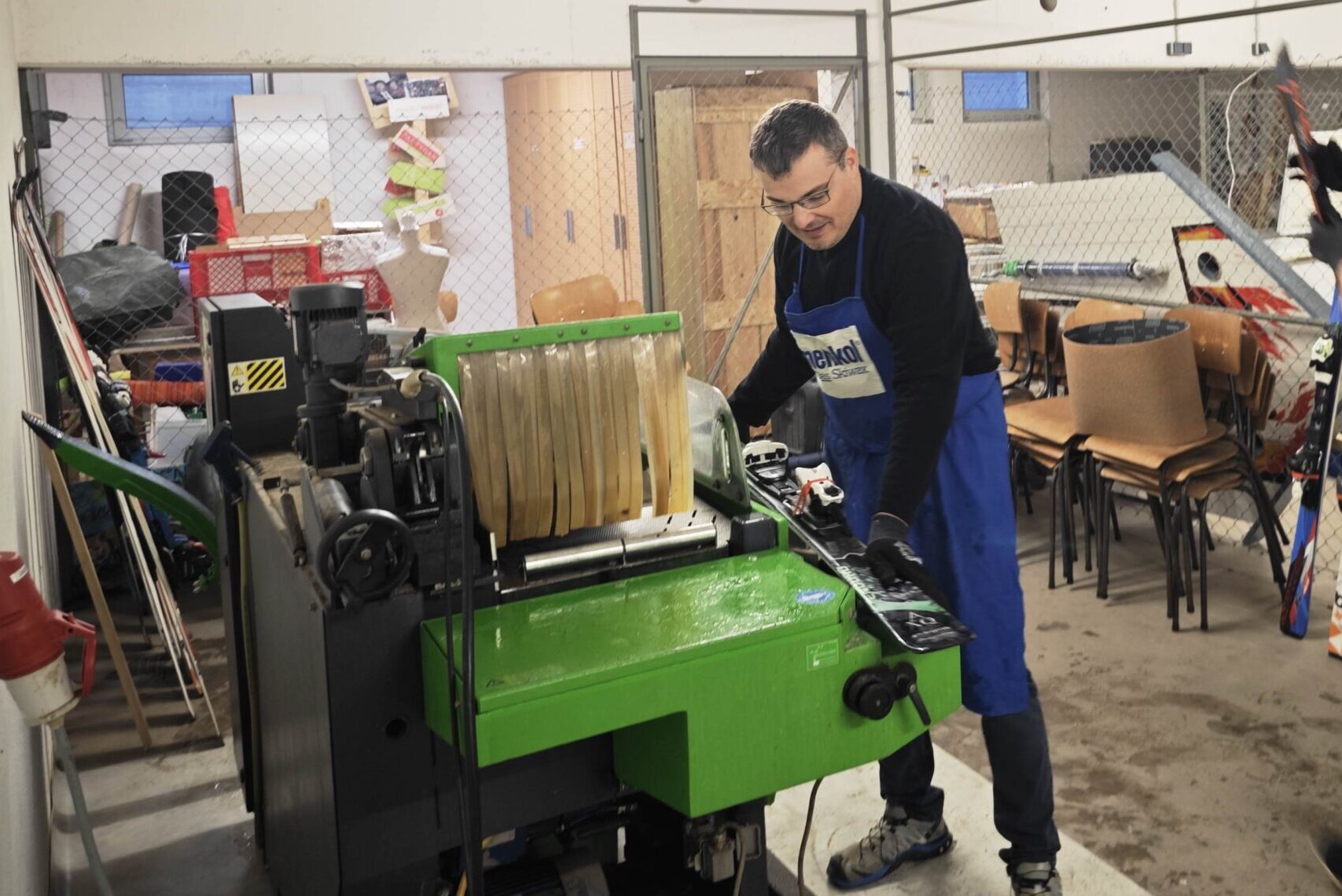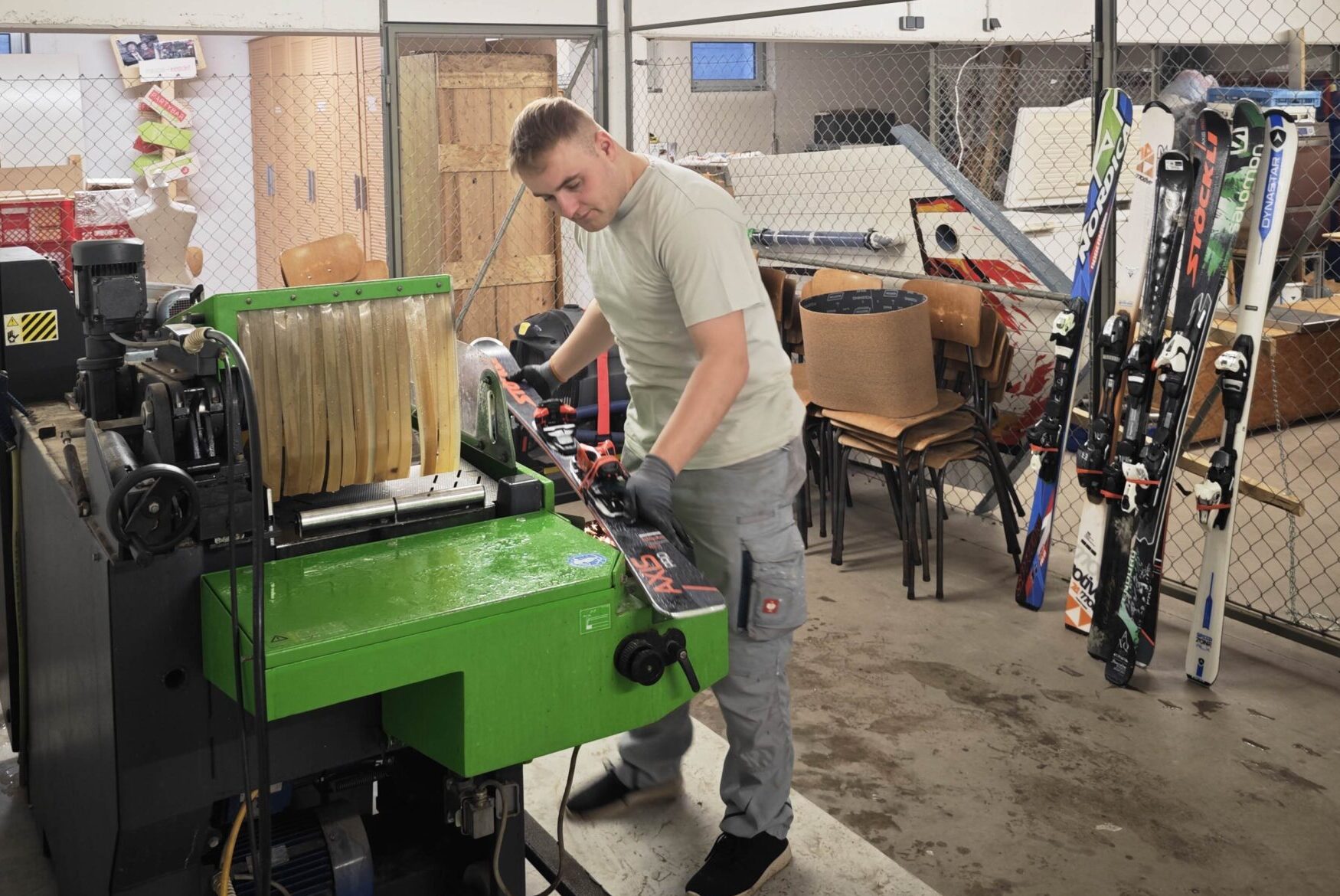 - Im zweiten Arbeitsgang werden die Kanten und der Belag auf der Schleifmaschine bearbeitet. Je nach Zustand sind bis zu drei Schleifdurchläufe pro Ski oder Snowboard notwendig.